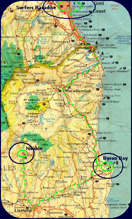 I immediately get on a bus to Surfers Paradise which is on the above map. After spending a day or two in Surfers Paradise, I take a bus to Byron Bay, the easternmost point on the Australian continent. Later on, I go to Rainbow Retreat in Nimbin where I will make and fly a batch of boomerangs. Then I will retrace my route to the Brisbane airport for my flight to Auckland.