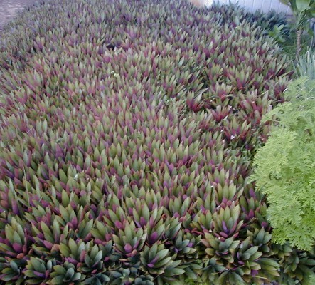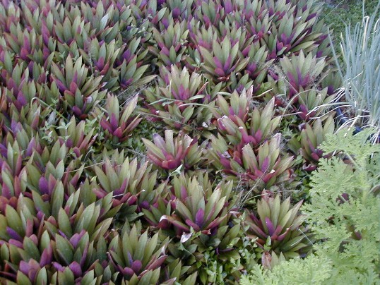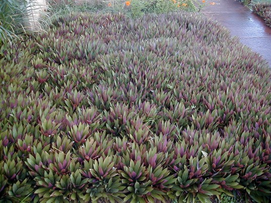 That's the patch that gave me the itchy rash. I didn't do the patch on the other side of the walk. Look how tightly packed these plants get. The oysterplants have a lot of stored water. The longest that I plan to be away is about three months. My neighbors will squirt water on them periodically, but even it they didn't the oysterplants would survive easily. Same with the other plants. You can see some weeds that have made it though above. This is how I hope it gets all over: