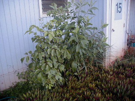Between the oysterplant patches and the building, I have to leave space to have two meters to be accessed and read as well as space for my garbage can. Except for the mosquito plants, green onions and ti plant, the rest of the ground cover is volunteers and weeds. Take a look at the battle looming between the spider plant volunteer and the mosquito plant: