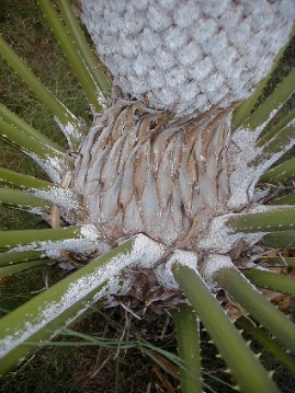 Over at Tashi's, there's another kind of battle going on. Her male King Sago Palm is being attacked by the Asian Cycad Scale (these are insects).