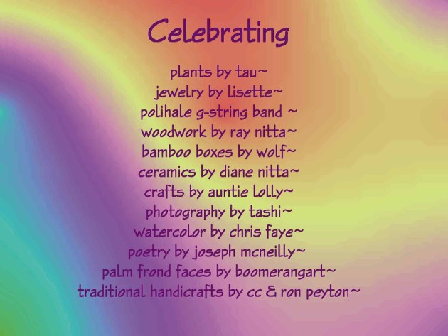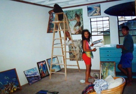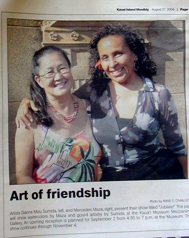 Back in 1993, after Hurricane Iniki, I was living in Tumu Nu at Polihale, with a HUD temporary disaster housing voucher wasting away in my wallet. I could live any place in the United States or its territories (except one), but I didn't want to leave Kaua'i and there was so much hurricane damage, that there were no rentals available. On May 18th, I went to the Koloa Library to see a video presentation on the Cook Islands. Mercedes wasn't going to the presentation, but happened to be in the parking lot. We talked story. She was opening a gallery in Koloa and wanted me to go check it out the next day. I told her about the hassles with the rangers at Tumu Nu and that my HUD voucher's last day was the next day...the 19th.