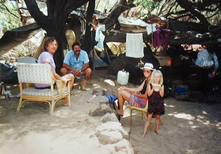 Tumu Nu. Walter, Clifford, Jude, and Erica. My tent is in back...I made the wall for the platform. The rocks were piled in this area when they were bulldozed out of what was to become a sugar cane field across the road. That's why the cane road went around the area of rocks. It was a junk place within the cane company lease of Hawaiian Homes land, adjacent to, but outside of Polihale State Park. I started Tumu Nu on October 7, 1992. Yes, there's a story.