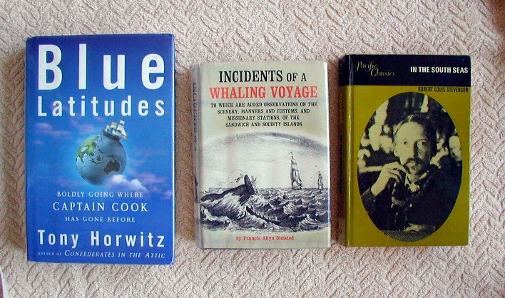 When I take a break, many times I pick up whatever book I'm currently reading and read. On the mainland I found that when I took a break, I'd usually remote-on the TV, and of course I could find something to hook me for longer than I wanted to be hooked. I prefer my system here, with no TV. (I don't think Mich missed it...he never said so). These are the books I checked out from the library...yes, I'm into Polynesia...past, present, and future: