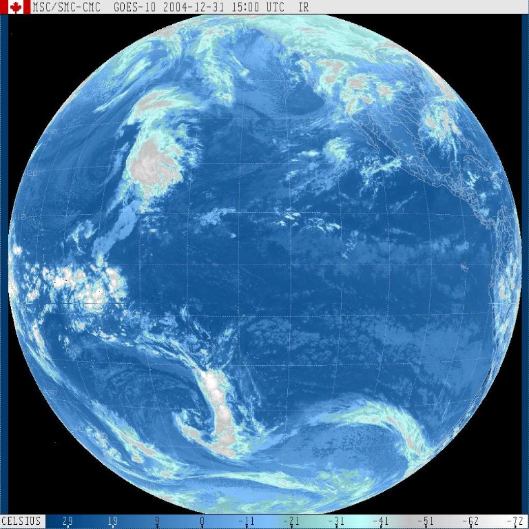 The Indian Ocean Tsunami disaster and suffering by so many has cast gloom over the year's end and beginning of the New Year. Even the heavens above Kaua'i and all the Hawaiian Islands are crying. There has been rain, rain, rain and dark skies that seem to be reflecting my mood. I made a copy of the Big Blue Satellite picture of the Pacific this morning which shows the huge mass of storm clouds hiding the Hawaiian Islands: