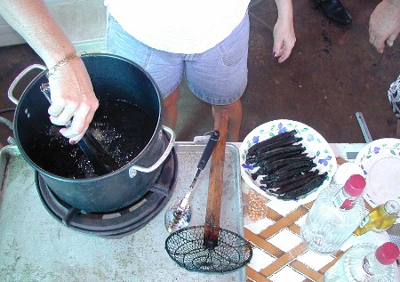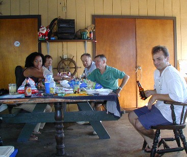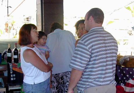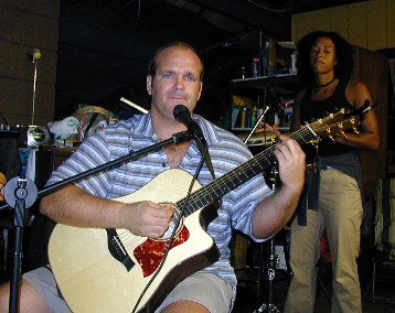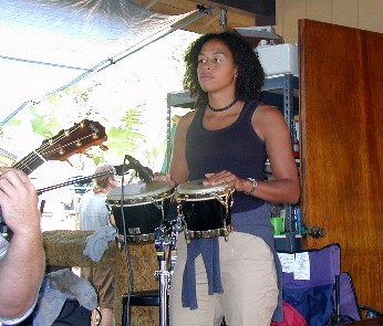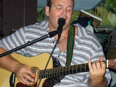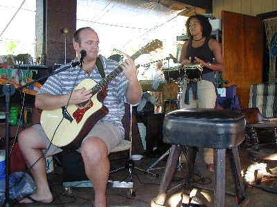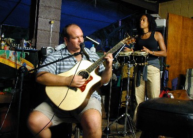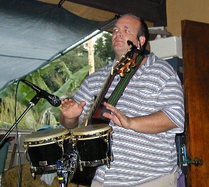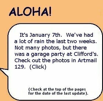 On the 2nd, Dr. Rick, the new Orthopedic Surgeon at KVMH (Kauai Veterns Memorial Hospital) in Waimea,and his lady, Janet, stopped by so they could follow Greg driving Steve and me toClifford's house for a garage party. He plays fine guitar and sings. He and Janet are from New York. They had been traveling in Australia and happened to stay at Doug's Rainbow Retreat in Nimbin, New South Wales. Doug showed them this website. Here's when I first met him (far down on the Artmail 119 page) at Tashi's Art Show (Janet hadn't arrived on Kaua'i, yet).