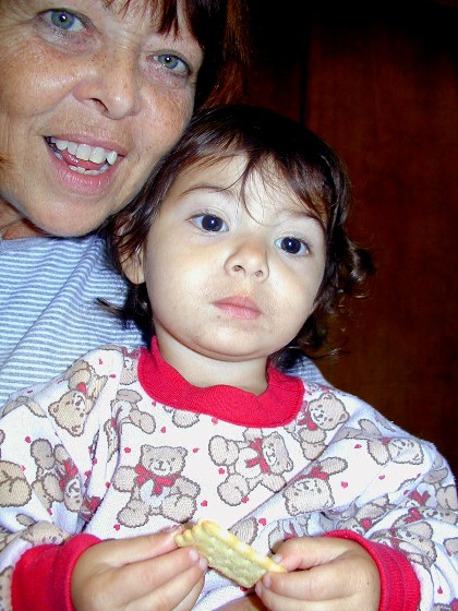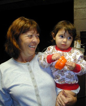 Linda holding Haily then cooking some of the ahi firecrackers.