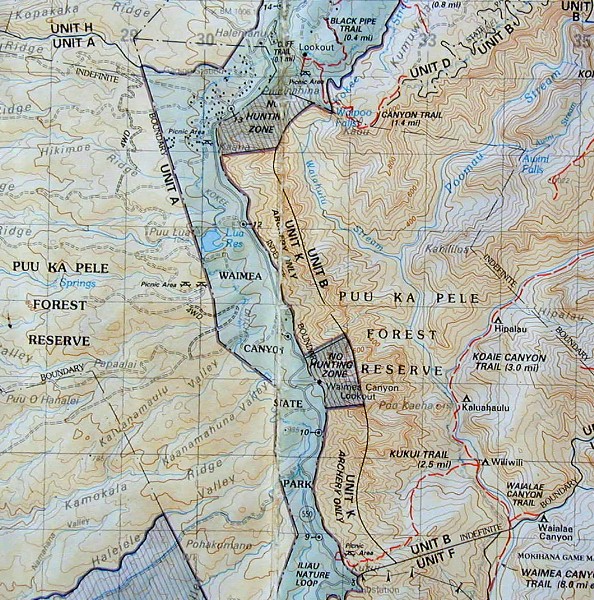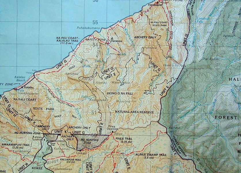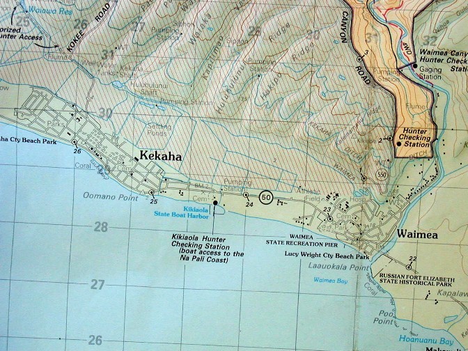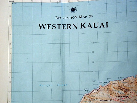 Here on Kaua'i, an important map for me is a large recreation topographic map of the island. I'm going to be using photos of that old, outdated map because the missing more recent buildings and roads are not what I use it for. It has the topography and trails easy to read. Here are some photos of it: