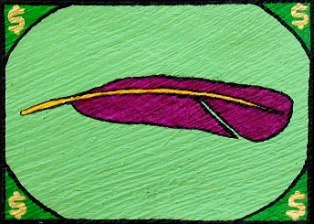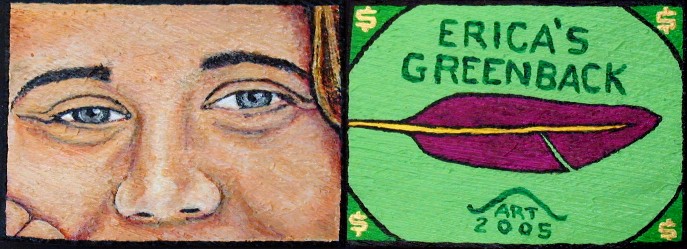 A lot of things started happening around the 4th of July weekend and I never got a chance to really start this Artmail before. The Purple Feather Greenback project has been delayed while I explore a variation of the idea. Here's what happened: I decided to paint a PF Greenback of Erica for her graduation-birthday party last month. It turned out pretty good (even though I could have continued painting for a better result). Erica liked it and appreciated the likeness of her image.