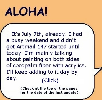 That was the first time I've ever tried to paint a real person like that. It is all experimental, anyway, because the painting on both sides of cocopalm fiber with acrylics probably is a new idea. Cocopalm fiber has been around and used by humans for centuries, but acrylic paints are relatively new...invented in 1964. Also, when in the Cook Islands last year, I checked out the palm fronds on the ground. Fungi! Probably, before the old palm fronds fall to the ground, fungi has already begun its work on the fronds and its fiber (The fiber I use is that which helps hold the frond onto the tree). Maybe, because Kekaha and Polihale have very little rainfall and low humidity, the fungus doesn't get started as soon. Anyway, most artists would probably reject the idea of painting on the fiber after trying to clean it before painting. So, until I hear or see on the Internet, otherwise, I believe I am the only person "painting pictures" with acrylic paints on both sides of cocopalm fiber.
