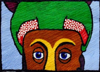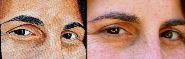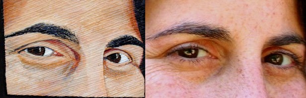 When painting with acrylics, (these comments are from my own observations, I have never had an "art course" nor done any research on techniques of acrylic painting) thin layers of colored plastic are laid down on plastic and its final effect on the color in the painting will be influenced by the color of plastic beneath it. The harsh darker colors around the eyes will be lightened and softened by following layers. And look at that darker part above the nose. Here's a closer look: