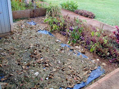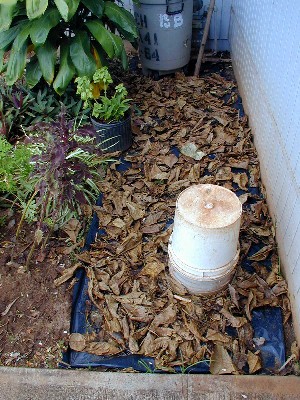 Change of subject: Last month, I found out that trees and plants must be at least three feet from the foundation of the building. I had to move my panax trees. I decided to make a little alcove which will be in the shade most of the time. I do not want to fight weeds, so I decided to put down black plastic in the 3-foot zone and in my alcove. Tashi's False Kamani tree produces a lot of leaves that are not moved much by the wind. I decided to cover the alcove and zone's plastic with some of those leaves. Later on, I have a plan with old palm fronds for the alcove.