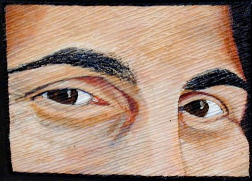 I painted and sent Lorilyn a Greenback and some cocopalm fiber to experiment with (as well as at least one piece of fiber already prepared with two coats of acrylic gesso) several months ago. I had hoped she or John, an artist friend, would experiment with the fibers and acrylics. Not yet. So, I emailed Lorilyn that if she sent me a photo with a good view of her eyes, I would attempt my second "real person" Greenback of her...and photograph the steps along the way which I would include in special webpages for her. (This process would be a lot easier than trying to describe all those little tricks that will be learned with experience. Lorilyn inherited myopia, too, but has never tried doing her art without corrective lenses).