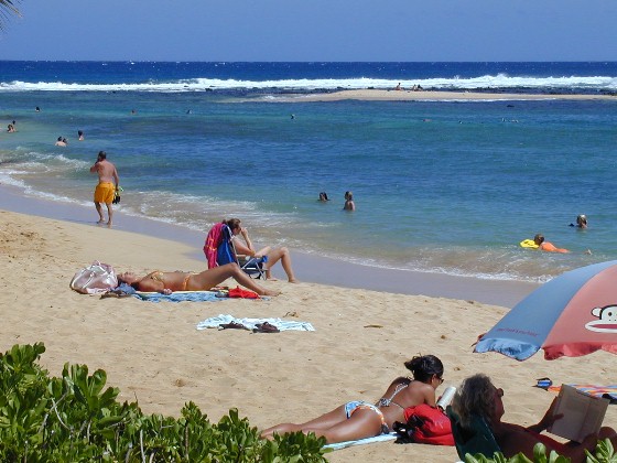 I'm in the process of doing a big stored stuff cleanup...taking photos of what I want to remember before throwing most away...so I've taken a break from painting and working on this website. Going through about everything I have stored in boxes and unfinished art projects and materials will take weeks and I want to get it completed before I travel. Last week, I went to Lihue then to Dallas and Gilbert's house/farm. We went to the Waiohai Resort's beach in Po'ipu for a swim. I was surprised at how crowded it was on a Thursday. Many of the people on the beach and by the pools will spend most of their vacations here and miss most of what Kaua'i has to offer visitors. Lucky I live Kaua'i. The lighting wasn't very good for snapshots, but here are a few: