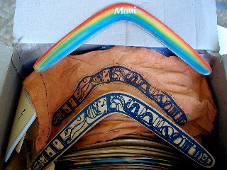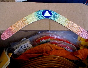 I throught that I would be throwing most of what is in that box away after I took photos. I had already photographed one of the boomerang boxes, just from the outside. I have now looked at only four of the boomerangs and many possibilities, that I had thought about in the past, popped into my head. Things that I could do, now, on the Internet with this website. Here's are three shots of the boomerang box with an early Aloha Rang, a Rainbow Rang and below it an Artrang with one of Lorilyn's Dreamscapes silk-screened onto a boomerang (I'll talk about these in a future Artmail), and an Artrang started by me on a boomerang that I had hand-shaped: