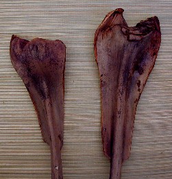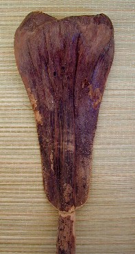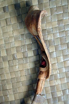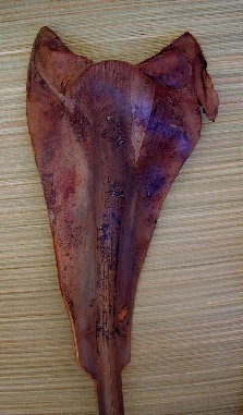 Most of the palm fronds I let dry before carving and working on them. The two above were carved while still wet. As they dried they would bend and twist into weird shapes. Here is one that I tried to carve the same way after it was too dry: