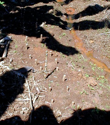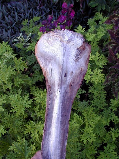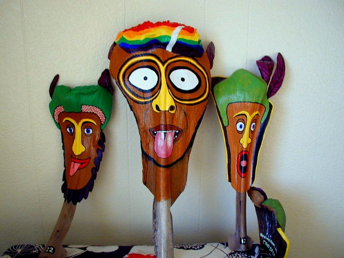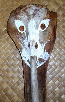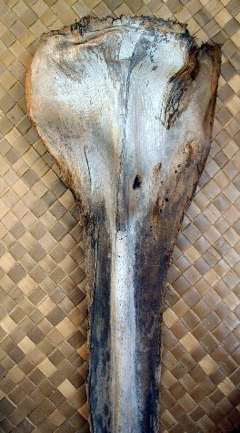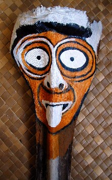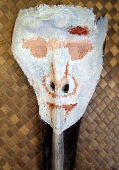 One of the projects that I have going is painting a palm frond mask for a local businessman. It happened at the Waimea Lighted Christmas Parade...A voice called out, "Hey, Boomerang Art." I looked and there was a friend holding up an old palm frond base that he must have seen nearby and picked up. He wanted me to paint one of my faces like the couple that he has already. It wasn't a very good looking palm frond and I have other projects. I had put painting palm frond faces on hold for now. But, he insisted and insisted, so I took the frond base and put it in my car. When I got home, I cut off ugly fibers and scrubbed it, then set it aside.