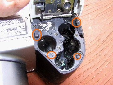 I mentioned last time that I had some camera problems that I had to get fixed. There are four plastic gizmos that, with the slide-lock, holds the battery case door closed tightly. In my haste to change batteries, I opened the door too quickly and broke the two lower gizmos pictured in the photo. To me, it looks like there are four little phillips screws to remove in order to easily replace the plastic piece that has three of the gizmos on it. I phoned a digital camera parts supplier, but could not find the part in the "exploded camera" diagrams. Without the name of the part, the supplier couldn't help me.