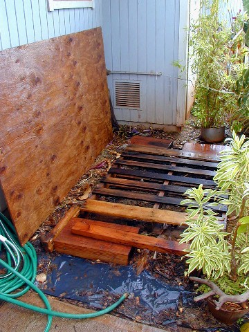 Two days later, I took some photos of my little front yard project at 15B. I decided to keep the 3/4-inch plywood platform that I used in the Polivan instead of making four bookshelves out of it. I had to buy a pallet when I had boxes shipped from the mainland. I decided that I could store the pallet under the platform in my little patio room. I later put three coats of polyurethane on both sides of the plywood platform/deck.