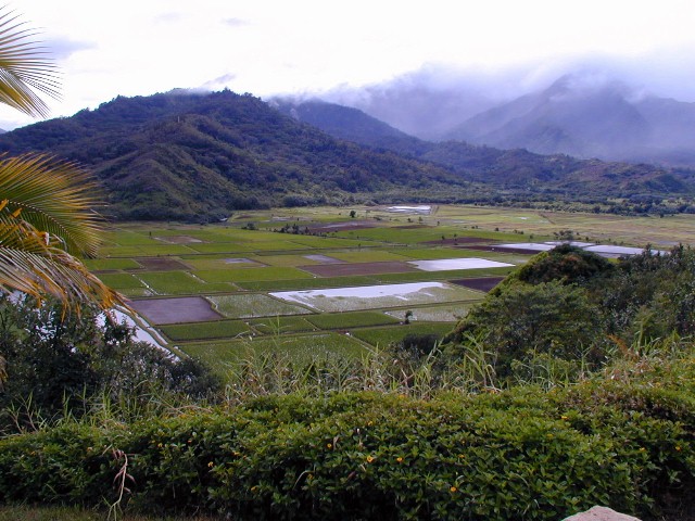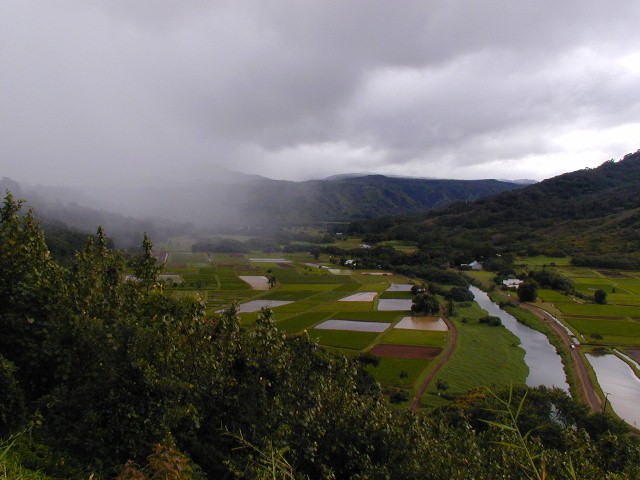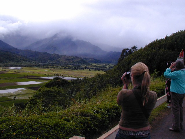 When we got to the end of the road, after two or three rounds of looking for a parking space, Birgit got out of the car to check things out while I waited in the car in a non-parking place. Then we headed back. Next stop, the Hanalei Valley Lookout...