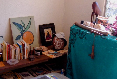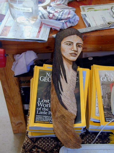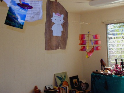 Happy Holidays everyone. It's been a busy time for me and the project I've given myself of scanning my old slides and photos is a slow process. The old slides from past travels have varying kinds of deterioration, dust, etc. which appear in the scanned images. It takes a lot of time to cut little pieces of clear sky to paste over the worst dark spots and lines which distract greatly from the "picture" before posting in last month's Artmails. I've also been doing some painting with acrylics on cocopalm fiber. My grandaughter loves "Hello Kitty" so I painted her with a Santa cap as seen above. The Hello Kitty is able to be separated from the background fiber. I enjoy little projects like that and learn from them as well.