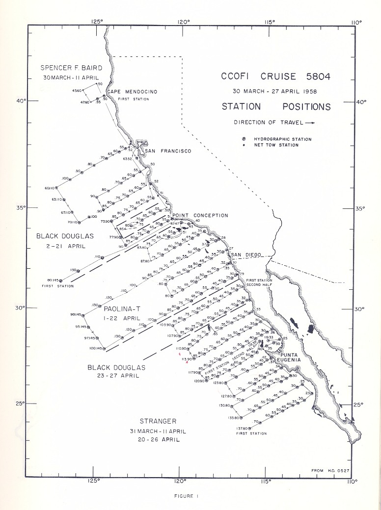 That Paolina-T cruise wasn't an exciting cruise, but it was my first and I didn't have to worry about seasickness. I didn't take many photos with my Brownie Hawkeye. This is a good place to put some of the photos from that time period (October 1956 to April 1957. The month and year the photos were developed is on the print). The Marine Life Research (MLR) cruises were usually about a month apart. Below is a chart showing the pattern of observation stations made by each of the research vessels for the California Cooperative Oceanic Fisheries Investigations (CCOFI).