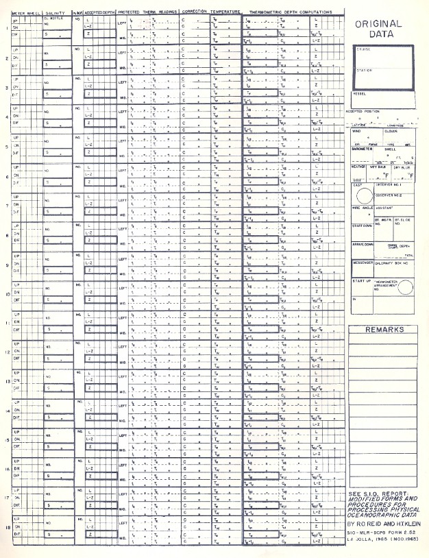 ...containing special thermometers that record the temperatures, would collect a sample of sea water at a particular depth for oxygen and salinity analysis. The original data was checked and rechecked at each station and recorded on original data sheets...