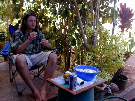 We talked story and ate some healthy fruit that Dave prepared for us. I made some popcorn. One of his students, who lives in Kekaha Ha'aheo, was surprised to see her teacher sitting at Boomerang Art's. She joined the group, but didn't want her photo taken.
