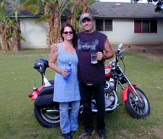 Walter, Erica and I had been friends for several years already...campers at Polihale. Walter and I played many games of backgammon. I played some with Erica, too. Erica is now married and has a baby and living on the Eastside. Anyway, here are two photos of Walter and his girlfriend, Coquette, and his present Harley. They stopped by one day so I could meet Coquette and talk story.