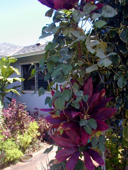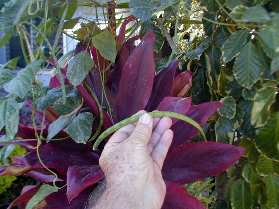 The beans in the onion container grew and eventually climbed the red ti plant stalk next to it and a bamboo stick that I stuck in a neighbor container...