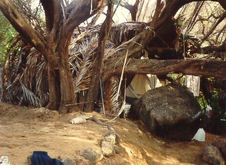 Anyway, I had a lot of piles of dead kiawe to cover, and I wanted to hide and shade Tumu Nu. For part of that process, I was guiding the wild beach morning glory by twisting it along twine which I arranged to form a network that would shade and hide Tumu Nu while still allowing an open space through which to obsreve the sun and the moon from the campsite...