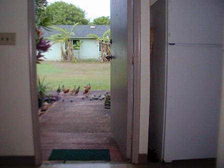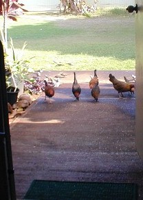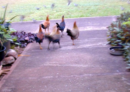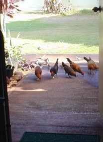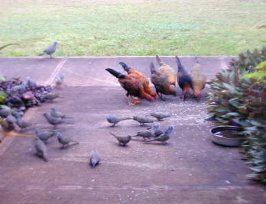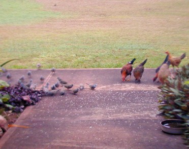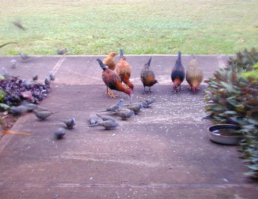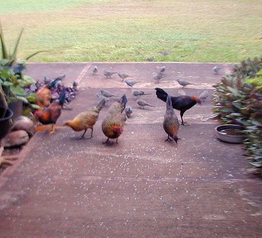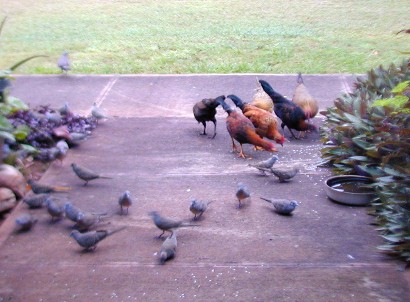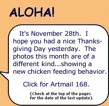 When I tossed out some rice, the little orphan chick would come running to the rice field. As The Orphan's size was as large as the doves and getting bigger every day. She would sleep by her mother's decomposing body and scratch for food among the roots of the big monkey-pod tree, but would come running at rice time. Other chickens were few and far between because of one of my neighbor's dislike of roosters crowing. The Orphan did not associate with the occasional groups (clutches) of chickens that would come by 15B...she would make herself scarce.
