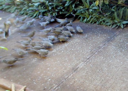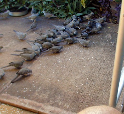 When there is a sudden noise or one of the new-to-the-scene doves panics, they all fly up in a bunch, but immediately come running back...
