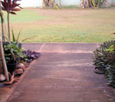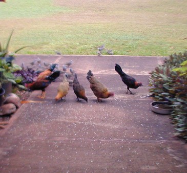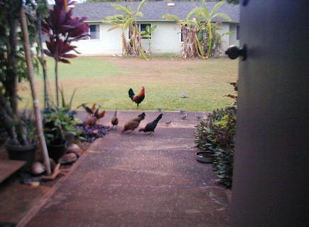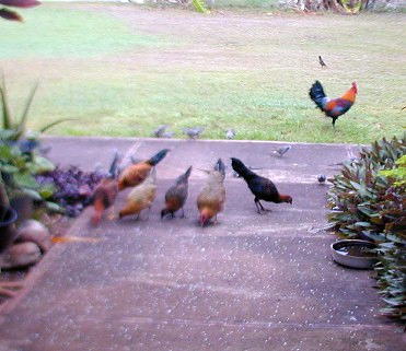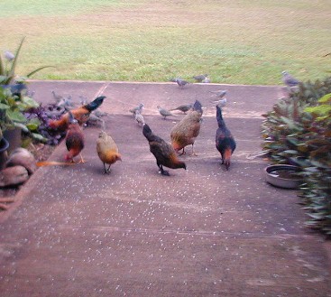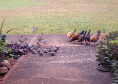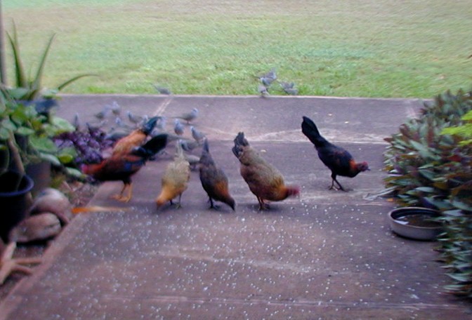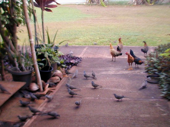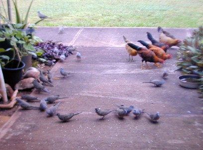 Most of he photos I have taken this month were of the zebra doves that know 15B's front yard is a feeding and watering place. The zebra doves hang out and keep an eye on me and my car. (Now, I drive the Tercel to Waimea for supplies). The doves have a characteristic pattern of eating the rice that I scatter on the walk. First, the doves that stay close to 15B most of the time approach the food in "dynamic lines" because they trust me. Secondly, other doves "get the message" that there is safe food at 15B and start arriving from all directions, but form those "dynamic lines."