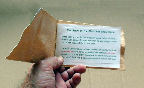 Before I talk about Kevin and Lorilyn's visit to Kaua'i, I'm going to put a copy of the Christmas Snow Horse I painted on cocofiber for a cover of the story booklet I made for my seven-year old granddaughter, Lauren.