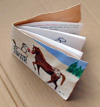 Creating homemade greeting cards had been a family tradition (which in the digital age has faded). Above, I made an adaptation of my cocofiber greeting to my granddaughter, Lauren, as a Christmas greeting booklet. My son, Michael, is an artist who has created Christmas greeting booklets since 1983...