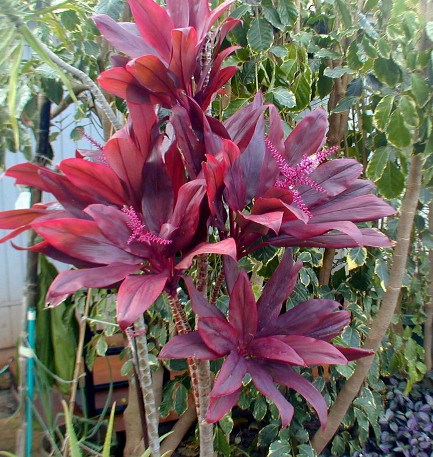 I haven't been in an Artmail-making kind of mood since the my old digital camera doesn't work. I took quite a few photos of some pretty interesting things, but only a few got saved to the card even tho' there was a click and a flash. I have a newer little camera that I'm not eager to start using. I'll put some of the last shots with the old one. My Auntie Lou ti plant was starting to bloom...