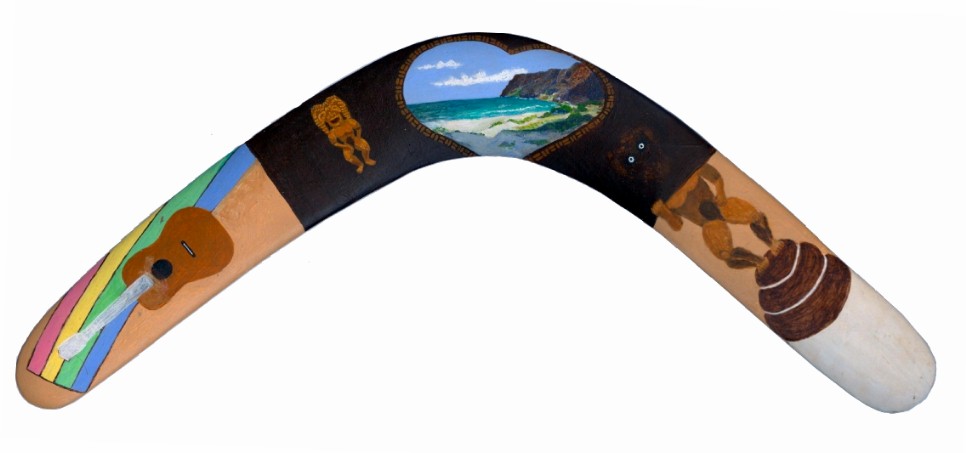 I'm going to be painting with acrylics again. This is the last boomerang that I shaped myself and was painting for Brian S. back in the early 1990s. I want to finish it and do some other art projects. I will also be scanning old photos and slides some of which may find their way to these Artmails.