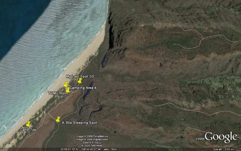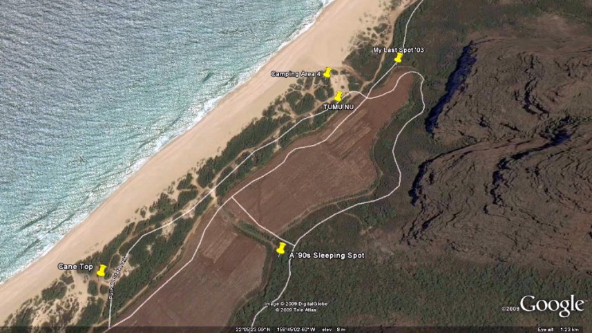 I did something different with this month's shaka photo of me...so it's larger here. Polihale is still closed. There has been rain on the weekends so the volunteers have not been able to work on the repairs. (Story here). I copied a google earth image of some of the areas that I stayed at Polihale through the years marked...