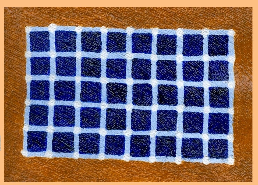 I have been doing a lot of things that have been keeping me away from getting an Artmail online in May. I have some photos taken at different times of the month around 15B that I will put into this Artmail. It has become more complicated...I download from the card to my desktop which has Vista. Then, when I make time, I reduce all the images to 1500 pixels. My web designer program doesn't work with Vista so I must email those images to myself and download them into my notebook. There's a problem there...the notebook's left cursor doesen't work any more. Rex M., a former student, sent me a Targus wireless mouse to use...Mahalo...It's tricky typing, then reaching for the wireless mouse instead of the cusor button. That's a time-taking process that I didn't have to do before. Now, (on June 4th) I'm going to put some of the photos and upload them to this page as I finish for that session. In the meantime you can try to count the Phantom Dots in the cocofiber painting below: