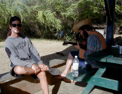 While I'm shooting the wave shots, Greg Miller, a bodysurfer, out of the photo to my right, keeps repeating, "Why aren't you out riding those waves?" Luke on guitar and Mike in the shades.