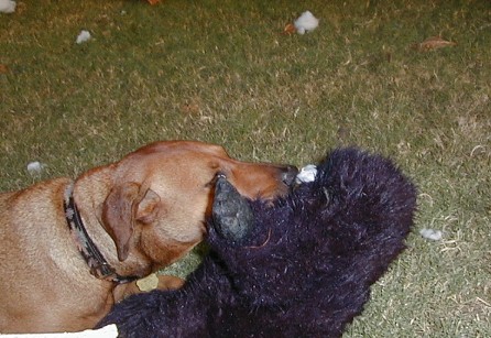 Maddie and Sophie have a stuffed gorilla plaything. Sophie is working on the eye holes.
