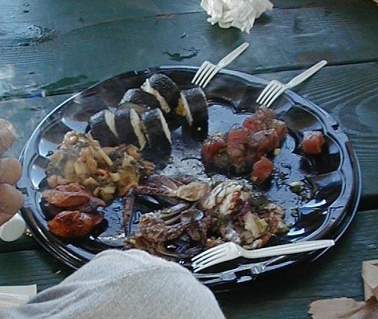 Alysa from Houston and Jeff from Atlanta enjoy raw fish for the first time.