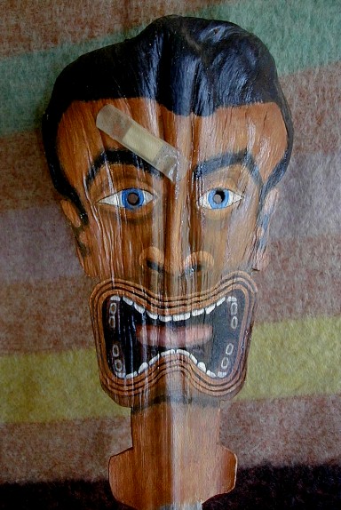 This is a mask with eye-holes. I was taking it to a show with some others and a piece of paint chipped off. I put the band-aid on it then. It will be repaired.