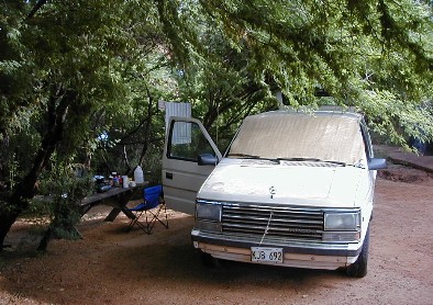 Two views of my van at CaneTop where I work, cook, and relax.