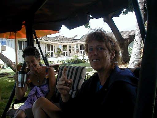 I did end up going to Polihale a week ago and I put the photos online last week. Between then and the 21st, the only photos I took were of progress painting palm fronds. Just about every day, I go to the post office for my mail then go to Tashi's for a swim and to talk story. Pat was there on the 21st and a lot of wind sailers were where we usually swim. I took one photo from Tashi's of two sails.
