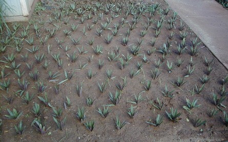 Tashi found the name of the plant. It's the Boat Lily or Moses-in-the-Boat (Rhoeo spathacea). It's a native of Central America. The small, white flowers are in boat-shaped bracts below the leaves. It is not a true lily...it's in the Dayflower Family. I will be taking progress photos as the ground cover develops.
