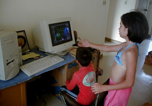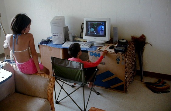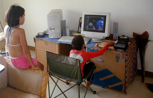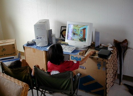 I have a lot of different things to work on for this Artmail, but some of that will have to be put up tomorrow or the next day. When I was working on Artmail 80, there was a knock on the door. It was RJ. He was coming for the present that I wasn't here to give him because I went to Polihale on the 23rd. I took a few photos. He wanted to play one of the educational games on the computer. Then his sister, Lani, rode by on her bike and saw his bike on my walk. She's a computer whiz and told him what to do then sat back and watched. Then she played. We got other CDs with more games. Then it was time to go and I came back in here and uploaded Artmail 80. Here are the photos: