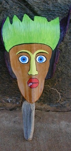When I decided to do the Purple Feather People project, these palm frond bases would be numbers 1 through 12. The original No. 1 is becoming The Impostor, now Kanaloa is No. 1. Anyway, after I had been painting on most of these 12, I went to the Double Burner Pavilion to find some more palm fronds. There were none left. The ones that I expected to get were burned and ruined. I searched around to see if I could find any palm frond bases that might work. The one below is the only one I found. It was even rejected for burning. Is there a face in there? I decided that this one will become Number 13: