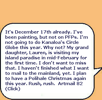 I have a lot to do with Artmail 82. There'll be some changes made. Last week, I made the Date-of-Artmails page. Reason: I wanted to send links to Artmail pages that would give my son's family an idea of what to expect at that time of the year in my world on the westside of Kaua'i. The Artmail links don't give a clue to the dates...now, the date page does. I figured that Artmails 35, (I'll set up at Camp 4 pictured). 36, and 38 will best show them what to expect at Polihale during their stay on Kauai. They will stay in Po'ipu.
