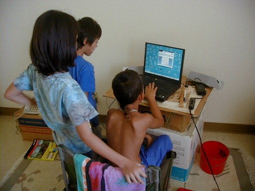 Lani and RJ watch Kapena at a computer game.